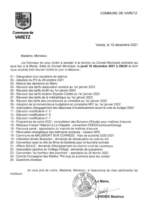 Accueil » Infos municipales » Ordre du jour du Conseil Municipal du jeudi 16 décembre 2021.Ordre du jour du Conseil Municipal du jeudi 16 décembre 2021.14 décembre 202114 décembre 2021 Le public est restreint à 2 personnes suite aux mesures sanitaires Étiquettes:16 décembre 2021conseil municiapl
