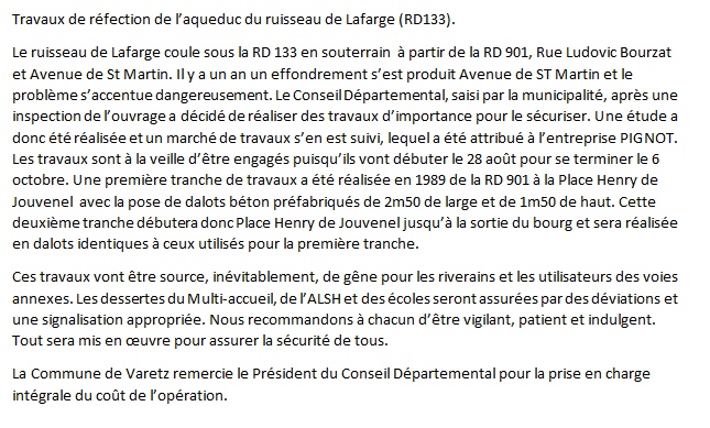 Accueil » Infos Quotidiennes » Travaux de réfection de l’aqueduc du ruisseau de Lafarge à partir du 28 Août 2023